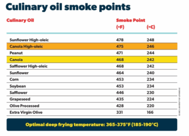 It is important to use a thermometer to keep an eye on the temperature of your oil. You also need to know the smoke point which differs on which type of oil you use. Canola oil is the best to use as it has a high smoke point.